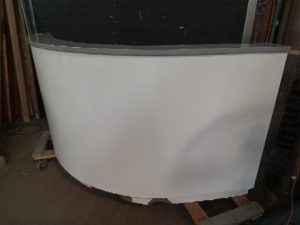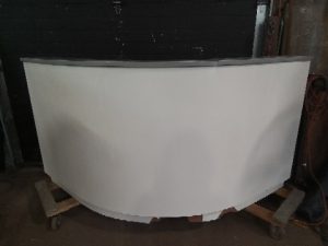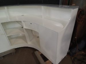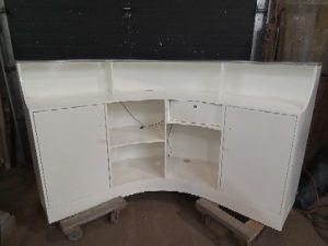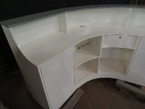 Curved reception desk with storage cabinets and holes to run wires. Finish on the top front has some damage and toe kick is missing some pieces