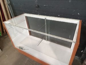 Glass Display Cabinet with textured glass back doors. Missing one shelf. Wood has some scuffing and scratches