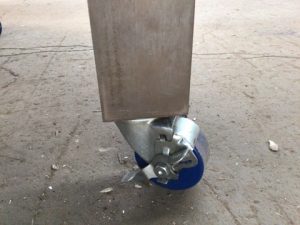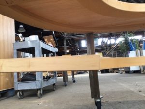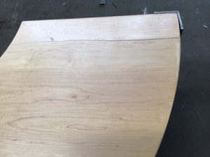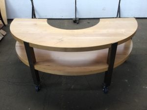 Mobile 2 tier half-round retail display table. Engineered wood with angle steel legs and casters. Top surface has a crack running along the flat edge on the right hand side.