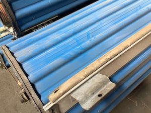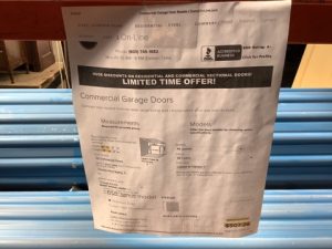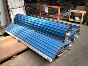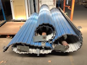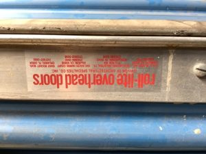 Roll-Lite brand corrugated steel overhead roll up door. Steel sheet curtain, blue exterior finish, white interior, with barrel assembly and mounting brackets.