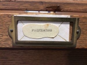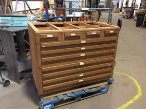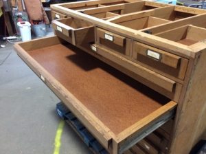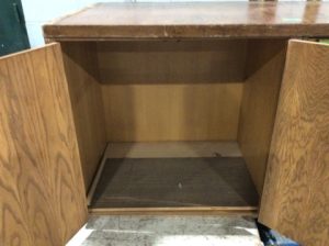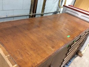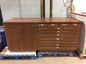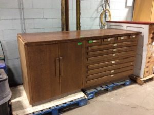 Reclaimed 3 piece cabinet used for storing priest vestments and altar linens. Oak and plywood construction, double door base, 10 drawer base and top. Salvaged by our deconstruction crew from former St. Rosalia School in Greenfield.