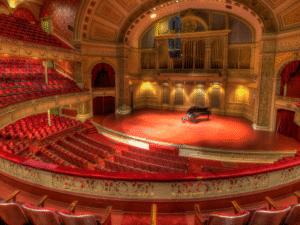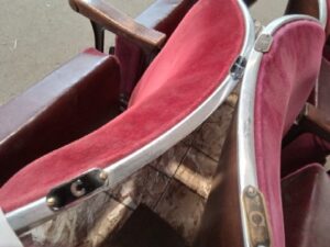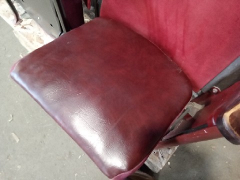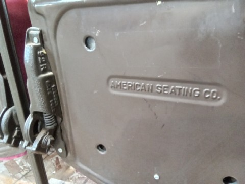 A piece of Pittsburgh history! Salvaged by our deconstruction crew. Run of 4 padded back, folding seat theater chairs, from the Carnegie Music Hall in Oakland. Cast Iron Legs – Made by the American Seating Company