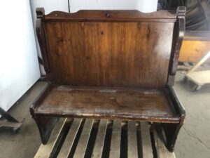Double-sided pine seating bench, ideal for restaurants. Offers great value and character with visible signs of use, reflecting its age. Sturdy, stylish, and functional for dining or decor needs.