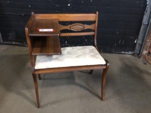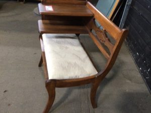 Vintage telephone bench gossip table seat. Traditional style, sabre legs with reeded detail, ornate back splat, two shelves. Solid wood construction, padded seat with white textured upholstery, some light damage to right rear seat joint.