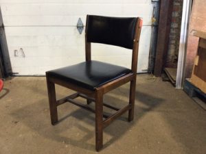 Jasper Furniture solid wood library chair. Mid-Century modern style, maple frame in a walnut stain finish, black vinyl padded seat and back. Some wear due to age.