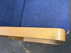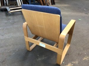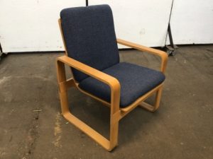 1974 Rud Thygesen and Johnny Sorensen designed Danish modern style low back lounge chair, model 5131. Laminated oak plywood frame and detachable curved seat with blue fabric upholstered cushion. Very minimal wear. Salvaged by our deconstruction crew.