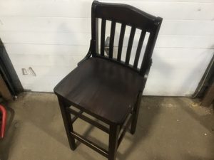 Commercial wooden stool with short 5 slat back. Shows use consistant with age.