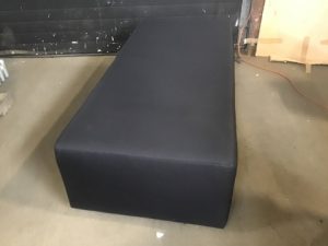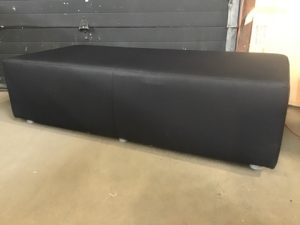 Haworth brand commercial waiting area lounge bench. Polyurethane foam pad with black synthetic fabric upholstery.