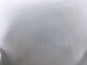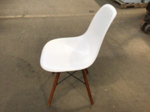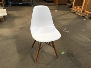 UrbanMod brand mid-century modern style dining chair. White molded ABS plastic shell seat with wooden legs, black metal bracing. 17 3/4″ H seat.