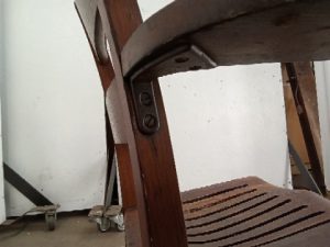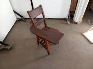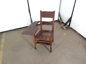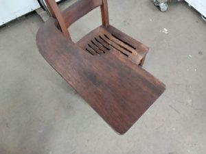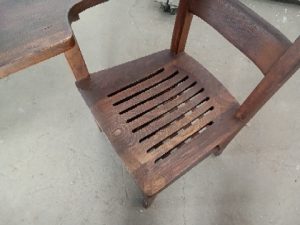 Antique Milwaukee Chair Co Student Desk – Solid Quartersawn Oak – Vast Iron Brackets – Slatted Seat – Finish has some wear and some joints are loose