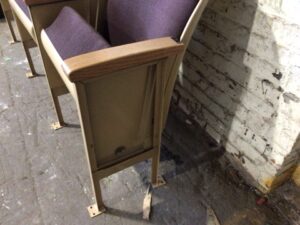 Vintage upholstered theater seat – 3 chair – fold up cushion – paint and upholstery have some wear from age and use – seat height when open: 16 inches – back rest height: 20 inches – some cushions close automatically and others need to be pushed closed