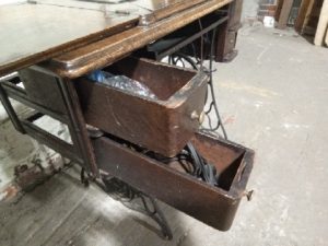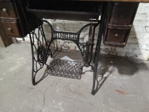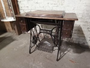 Antique singer treadle sewing Machine – Treadle Moves Freely – Machine is not in functioning condition – finish is worn – 2/4 knobs on the drawers are broken off