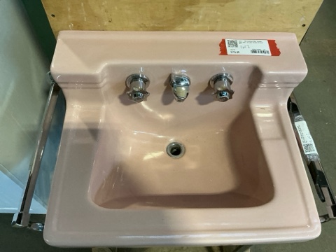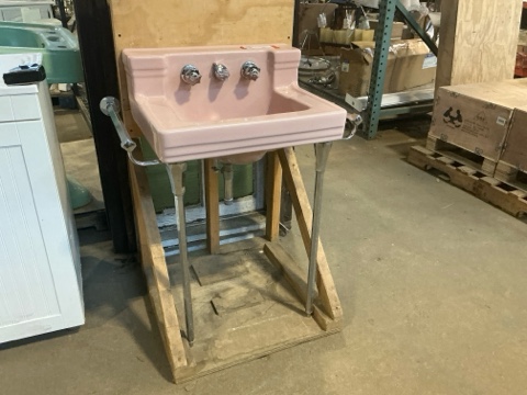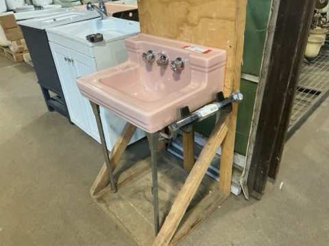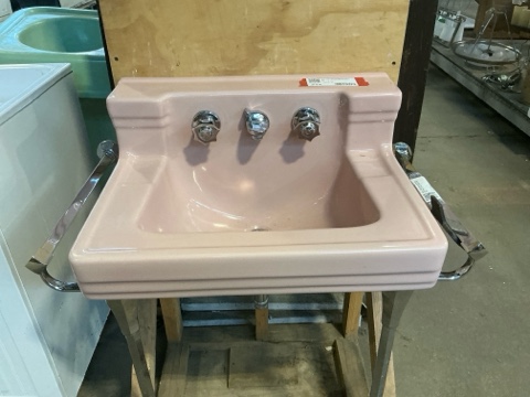1953 Standard Mfg. Console Sink – pink, with legs, towel bar, and mounting bracket. Excellent Mid-Century Modern design in very good condition. A rare vintage piece perfect for retro bathroom restorations.