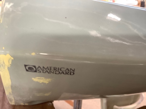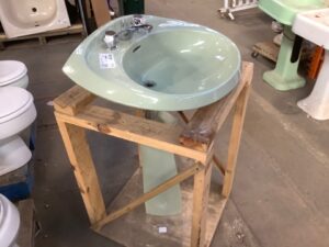 Vintage American Standard bathroom pedestal sink in rare seafoam green. Classic 1950s–60s mid-century design. Two-piece set with timeless styling, ideal for retro bathroom restoration or period-correct remodel projects.
