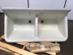 VIntage American Standard cast iron double basin utility sink. White porcelain enamel finish with beige painted bottom and matching legs. Salvaged by our deconstruction crew.