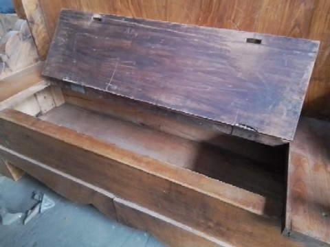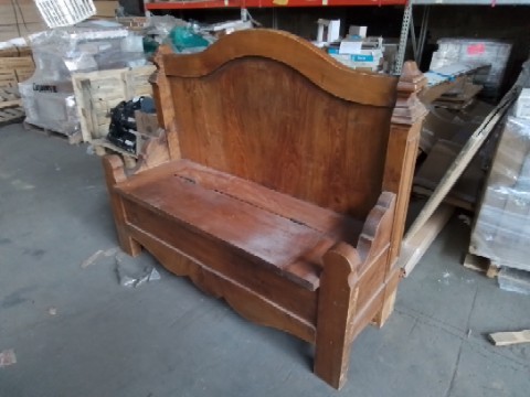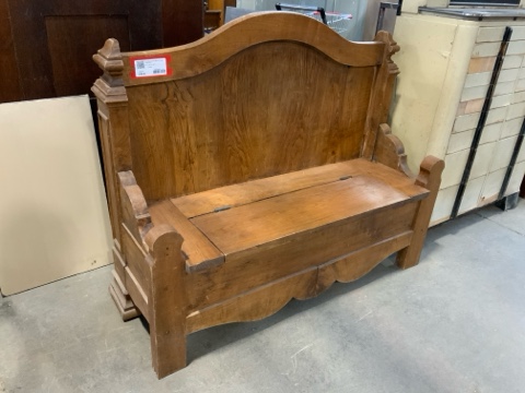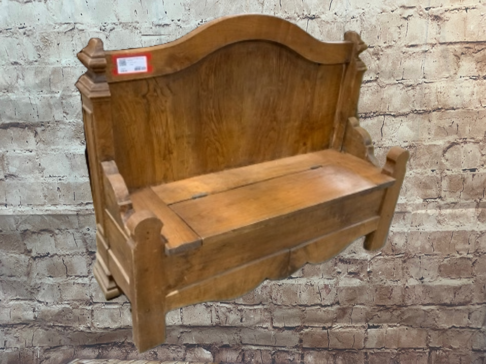 Solid wood entryway bench with a spacious chest storage compartment. Features elegant church ends and a bookmatched back for a classic, timeless look. Perfect for adding charm and functionality to any space.