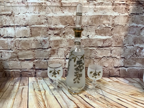 Bohemian Clan wine decanter set from 1980s made in Czechoslovakia. Includes a glass decanter & 2 glasses with a floral pattern. Top gold missing on one glass. Elegant vintage charm for collectors & wine lovers!
