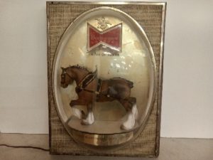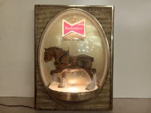 Plastic lighted bar sign- Budweiser "The King of Beer" featuring the "Famous Budweiser Clydesdale Horse". Tagged on back "Lakeside Plastic 2151973" and "Union Made"! In working order.