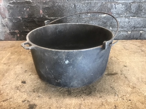 Cast iron bean pot, also known as a cowboy pot, featuring a sturdy bail handle and classic utilitarian design. Measures 11″ L x 12″ W x 5½” H. Ideal for campfire cooking, hearth use, rustic décor, or cast iron collections.