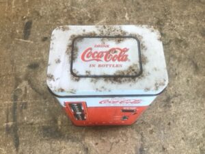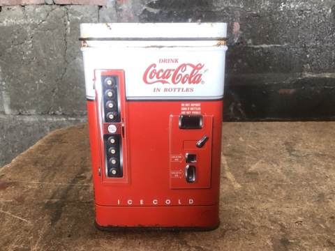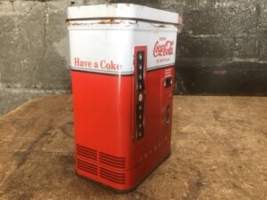 Coca-Cola Vending Machine Replica Tin Container, Mid-1990s Vintage. Classic Soda Memorabilia with Original Graphics. Shows Light Surface Rust for Authentic Patina. Great Collectible or Display Piece for Coke Fans.