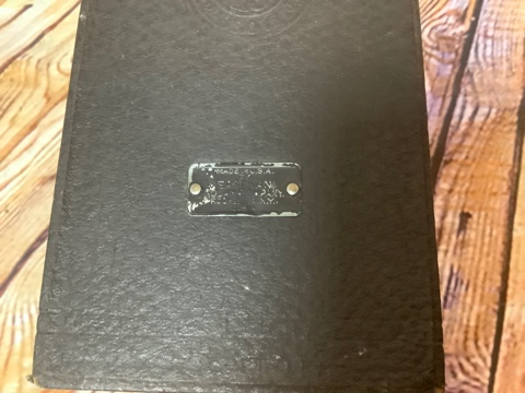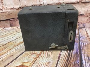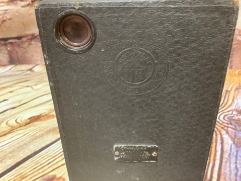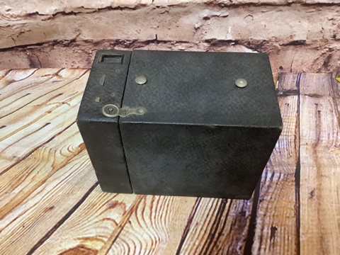 Eastman Kodak Co No. 2 Brownie Camera, introduced in 1901. Features leatherette-covered cardboard construction. Handle missing; classic piece of early photographic history.