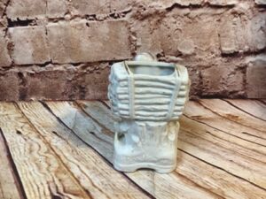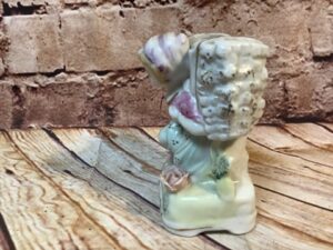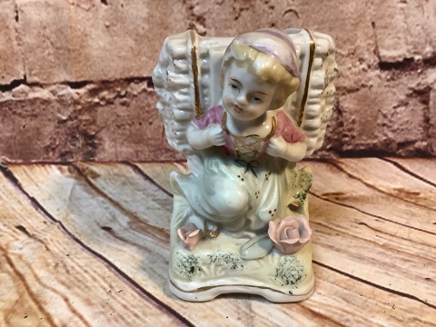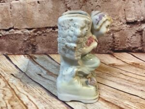 European Country Girl Porcelain Pencil Holder/Vase. Vintage Victorian-era style with vibrant colors. Shows some wear consistent with age. Unique and charming piece for decor or use.