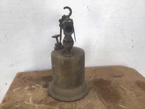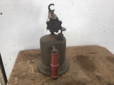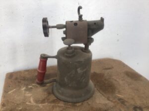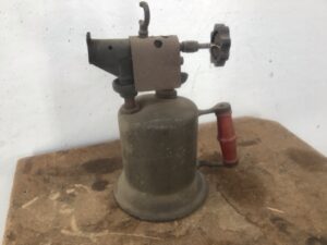 Steel Gas Torch with a 10-1/4 inch body and a red handle. Ideal for display, it features a charming patina and signs of use, making it a unique collectible for enthusiasts.