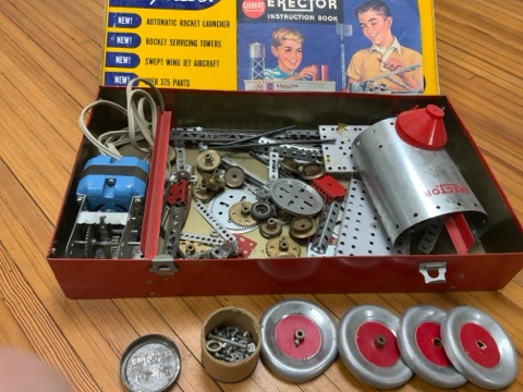 Vintage A.C. Gilbert American Science Series Erector Set with working 1959 electric motor. Incomplete set featuring steel parts, pulleys, and original metal case. Ideal for collectors, restoration, or display.