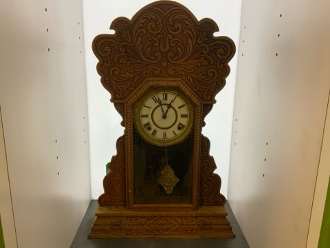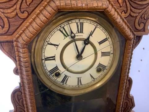 Antique gingerbread mantel clock with ornate carved wooden case. Runs and chimes properly, showcasing classic late‑19th‑century style. Original glass panel is cracked. Ideal for collectors, restoration, or vintage décor display.