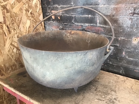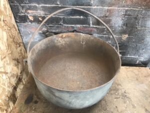 Antique Cast Iron Kettle/Cauldron – 3-legged design, 21″ diameter. Sturdy and rustic with timeless appeal. Perfect as a display piece, garden feature, or unique collectible for antique enthusiasts.