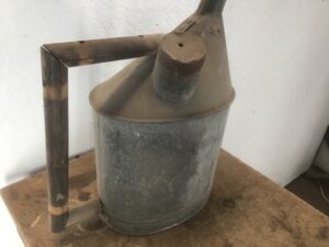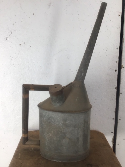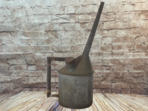Vintage galvanized steel railroad oil can with a long neck for precision pouring. Durable and rust-resistant, it’s perfect for collectors or practical use. Adds a touch of industrial charm to any setting.