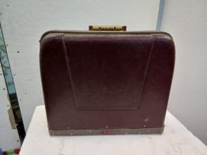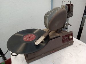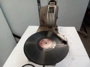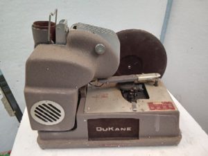 Dukane Projector that was made for playing developed 35 mm film strips while playing a record of your choosing. It has been tested with a 78 rpm record and did play when started but slowed and stopped. Currently the projector function isn’t working