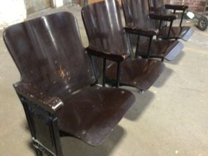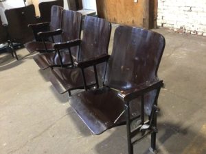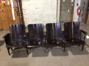Reclaimed row of 4 antique theater seats. Mahogany veneered plywood seat and back, solid wood arm rests, black finish cast iron legs, 1 ornate – 1 plain end cap. 20in depth w/seat down. Salvaged from the old Coraopolis municipal building council chambers.