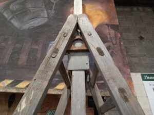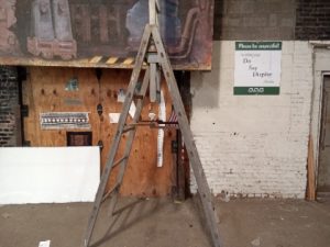 Vintage oak extendable trestle ladder. Wood is worn and has heavy patina. For display only