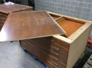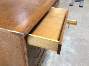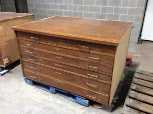 Salvaged church vestments cabinet. Plywood construction, oak veneer removable top and solid oak faces, flush inset drawers with brass wire bar pulls. Sides are unfinished. Bottom drawer sticks.