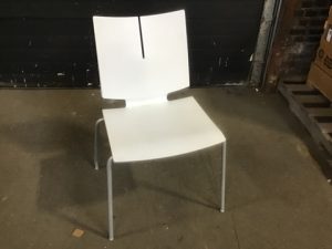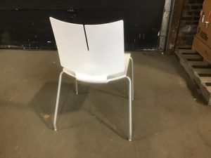 Versteel brand Quanta Max model stacking office chair. Snow white poly shell seat with Whisper grey finish steel legs.