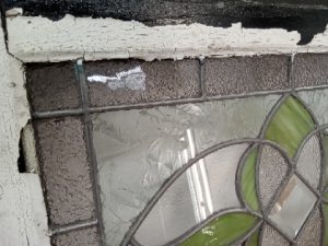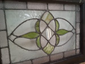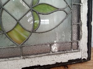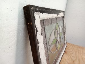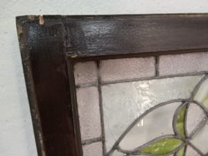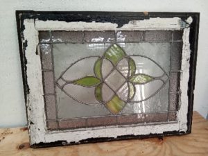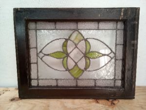 Leaded glass transom window with Frosted and green slag glass flower – glass and leading are in good shape with no missing pieces or cracks – wooden frame has old paint and scratches