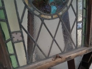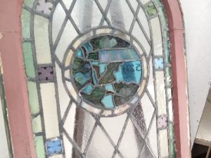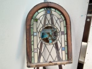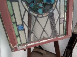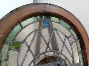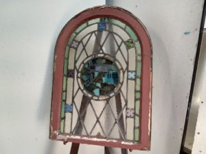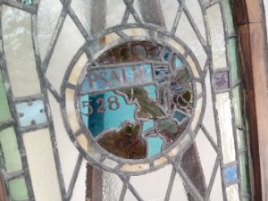 Antique stained Glass church window with Psalm 538 written in the middle – some Glass has some small cracks and some leading is missing – salvaged by our deconstruction team
