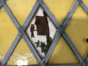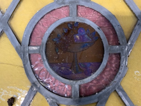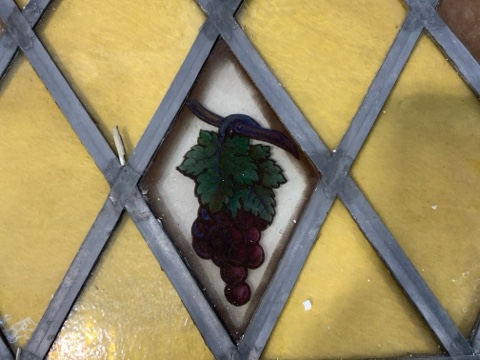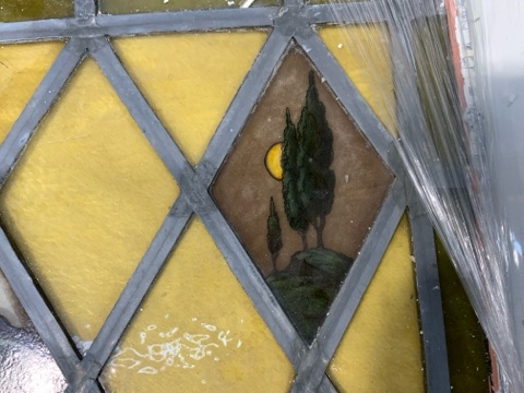 Stained Glass – Vintage Transom Panel with Diamond Pattern in Warm Yellow Tones. Classic architectural salvage piece. Some cracks and lead came wear—needs light repair. Beautiful color and charm for restoration or repurpose.