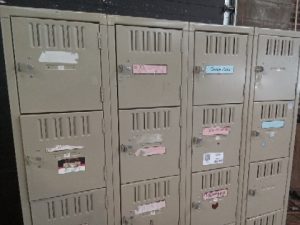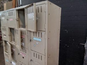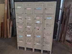 20 door metal locker unit designed for use with personal padlocks. Has some rust and stickers/adhesive
