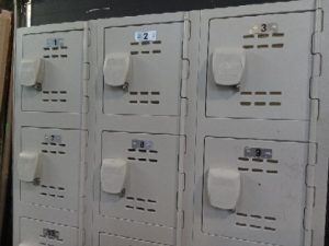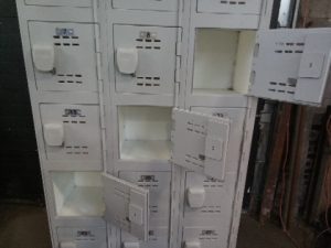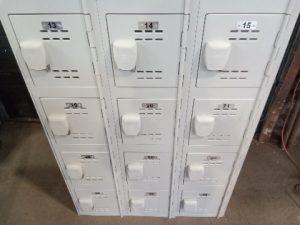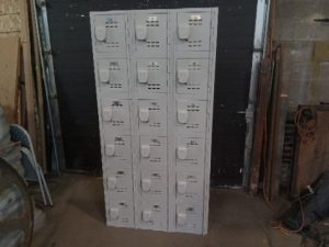 Plastic Storage Locker with 18 separate units that can be locked with a personal padlock. Locker is almost entirely Plastic which means it will do well in damp environments. Unit has scuffs and scratches from use .