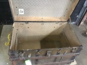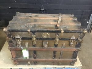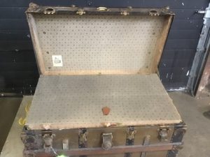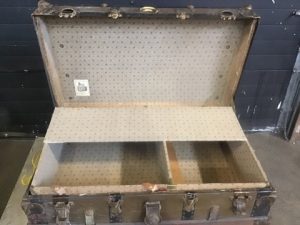 Vintage steamer trunk. Green covering with black binding, wooden slats, ornate brass hardware including corner caps, clamps, dowels, latches, lock and receiver, partial leather straps, fabric lined interior with upper organizer box.