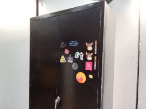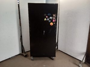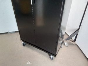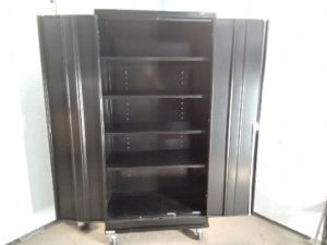 Uline metal storage cabinet – 4 adjustable shelves – rolling Base with braking casters – no key