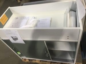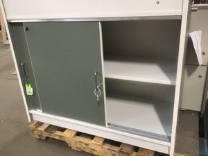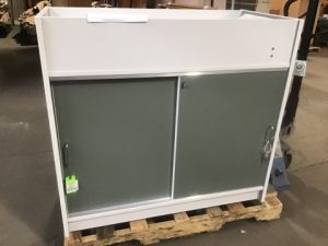 Whitney Brothers WB0721G EZ Clean Infant Changing Cabinet. 3/4in green and white melamine construction. 7.5in changing well with heavy duty tub insert, locking double sliding doors with keys, 2 bottom shelves. Surplus item, never previously installed.
