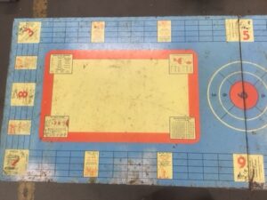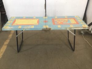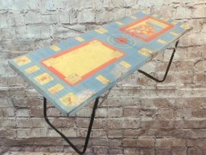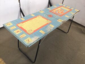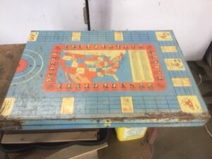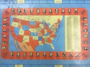 Vintage 1950s Folding Metal Gaming Table – Features a colorful United States map and 34 Presidents. Well-loved with scratches and surface imperfections, adding to its retro charm. Perfect for collectors or nostalgic game nights!