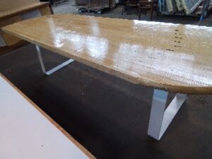 Table – 10′ Repurposed Bowling Alley Wood w/Arrows – Striking feathered ends add a unique touch to this amazing conversation piece. Durable, stylish, and one-of-a-kind – perfect for dining, workspace, or display.