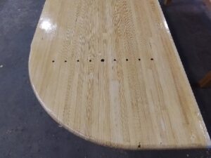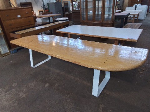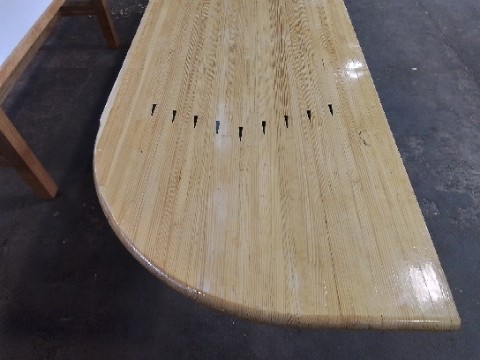Table – 10′ Repurposed Bowling Alley Wood w/Arrows – Striking feathered ends add a unique touch to this amazing conversation piece. Durable, stylish, and one-of-a-kind – perfect for dining, workspace, or display.
