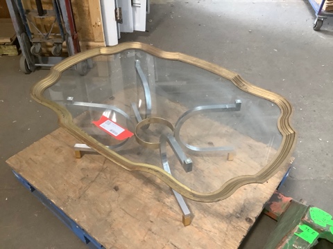 1970s Coffee Table – Scalloped glass top with gold-tone metal frame and curved chrome supports. Stylish vintage design in good condition, perfect for a retro living space.