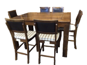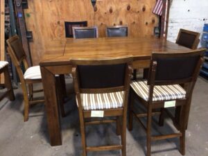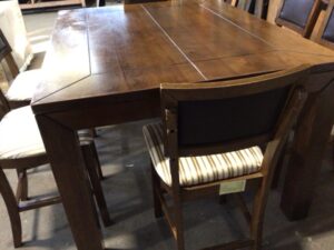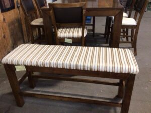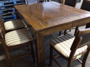Wooden dining table with 6 upholstered chairs and a bench – includes a butterfly leaf that when open, the top measures 60x60in – the table and chairs have light wear from general use and 1 chair has been repaired –