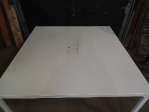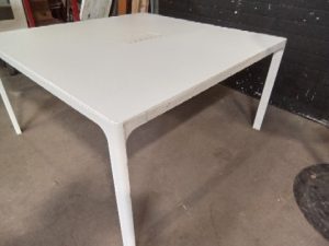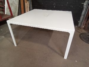 White ikea bekant conference table with metal legs and cable accessories port in the center – Legs and top have some wear and scratches